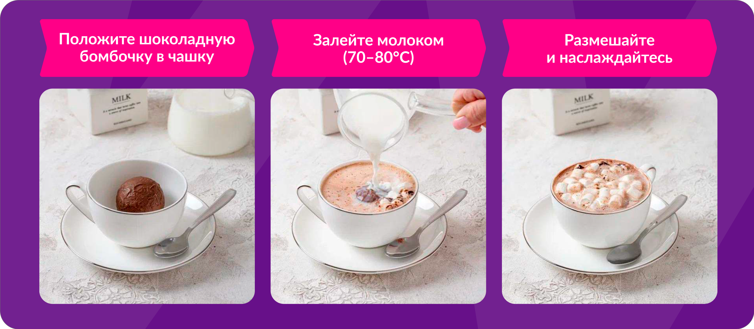 3 Набора из 3-х шоколадных бомбочек с маршмеллоу внутри будет прекрасным подарком на праздник и просто поводом для совместного уютного семейного вечера за чашечкой какао.